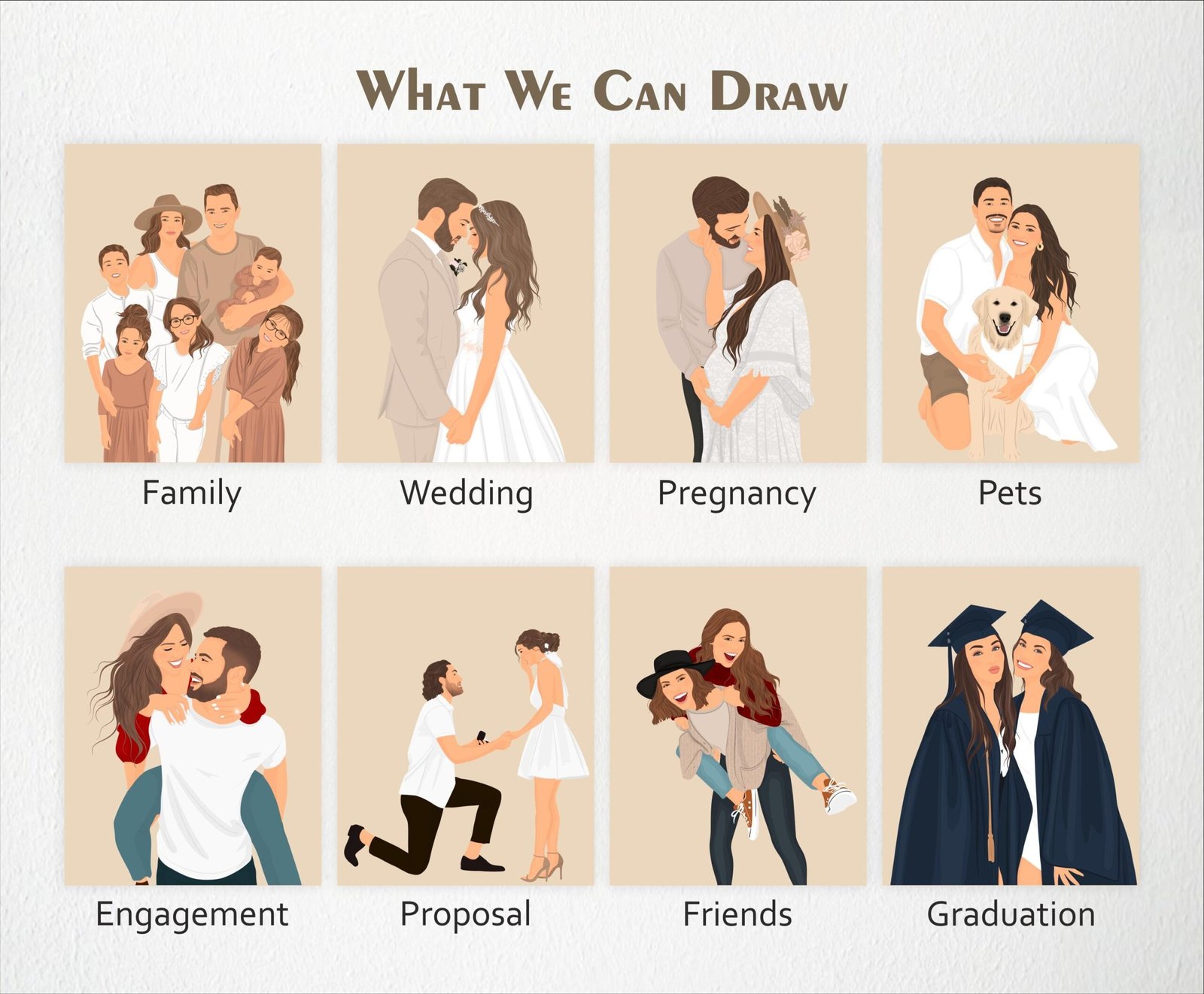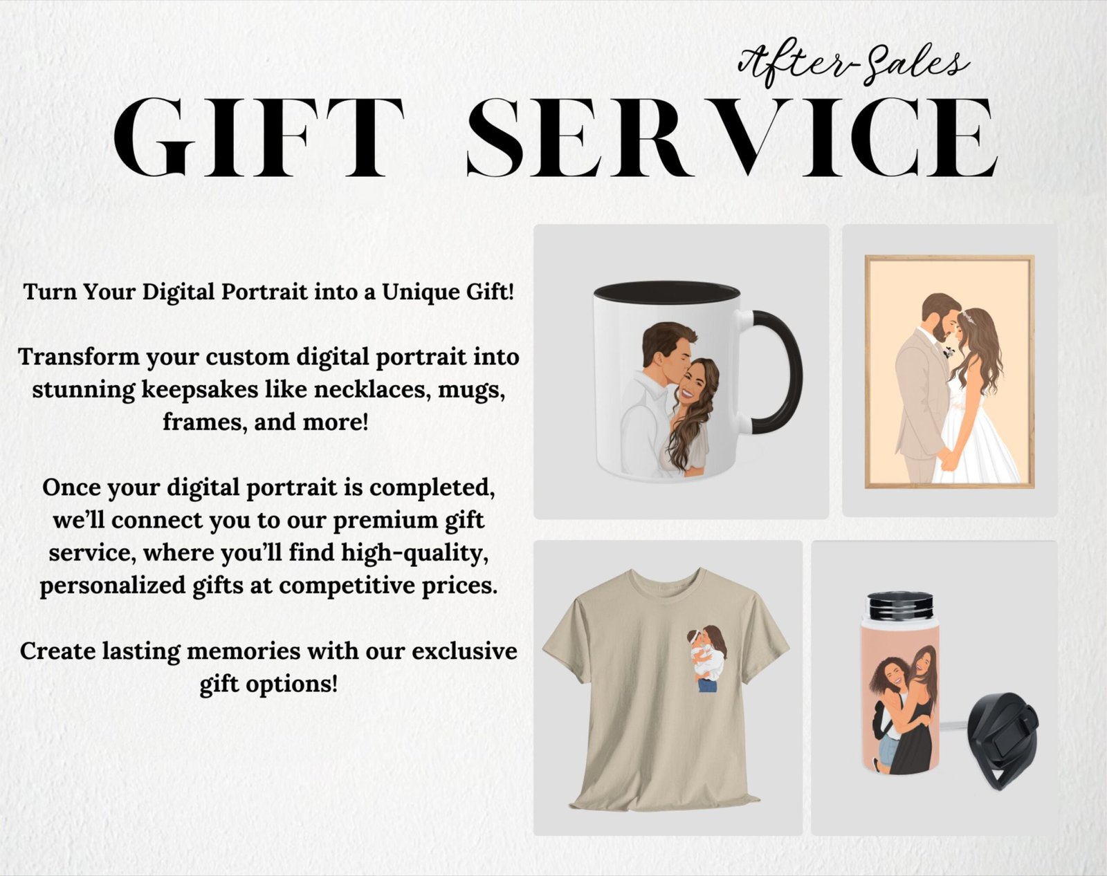 - Custom illustration: Transform your chosen photo into a hand-drawn portrait, capturing the essence and emotion of the moment.