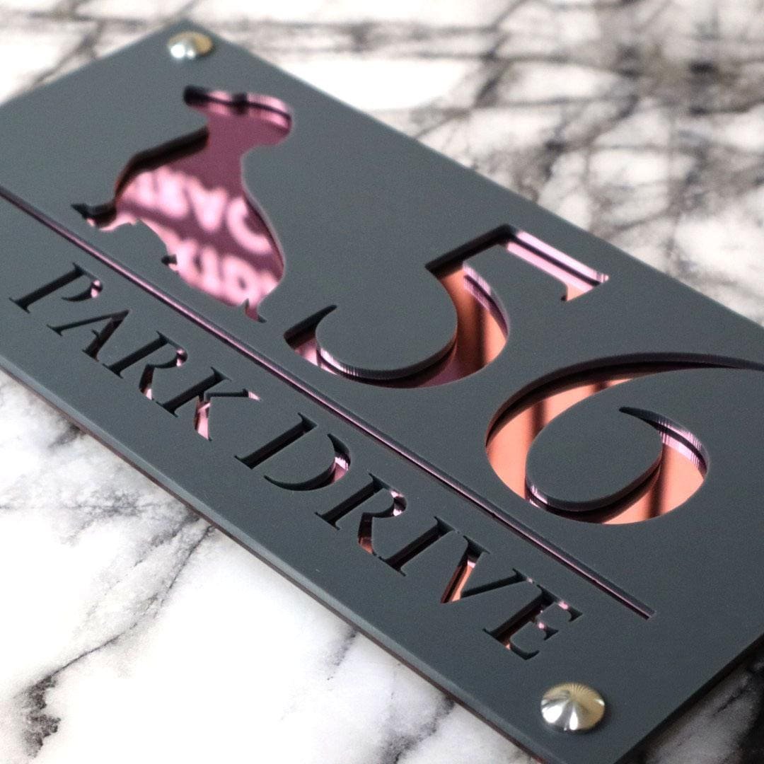 Crafted with premium materials including a Matt Gray (Anthracite) Perspex front, your choice of mirrored or marble effect backplate, and four stainless steel fittings, this 280mm x 140mm sign is a unique blend of pet love and luxury signage. It arrives complete with a fitting kit and wall template for easy installation.
